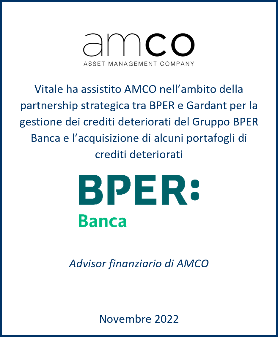 Vitale ha assistito AMCO nell’ambito della partnership strategica tra BPER e Gardant per la gestione dei crediti deteriorati del Gruppo BPER Banca e l’acquisizione di alcuni portafogli di crediti deteriorati.