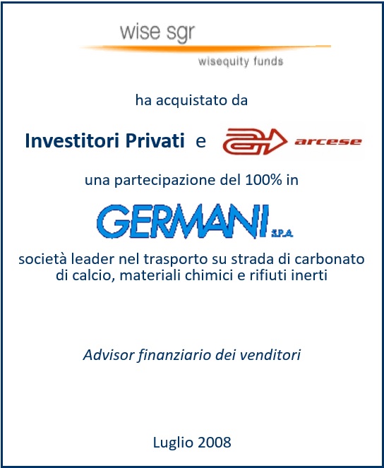 Assistenza al Gruppo Arcese nella cessione del 100% di Germani SpA, società leader in Italia nel trasporto di prodotti chimici e rifiuti inerti, con un fatturato pari a circa € 36 milioni, a Wise Equity, società di gestione di fondi di private equity.