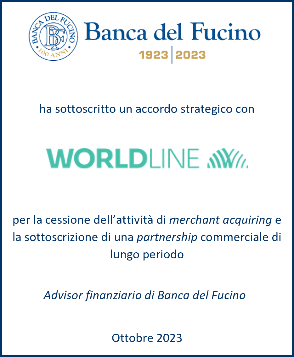 L’accordo include il trasferimento alla controllata italiana di Worldline dell’attività di merchant acquiring sul circuito nazionale di Banca del Fucino e una contestuale partnership commerciale di lungo periodo per la distribuzione tramite la rete di Banca del Fucino dei prodotti e servizi di pagamento di Worldline.