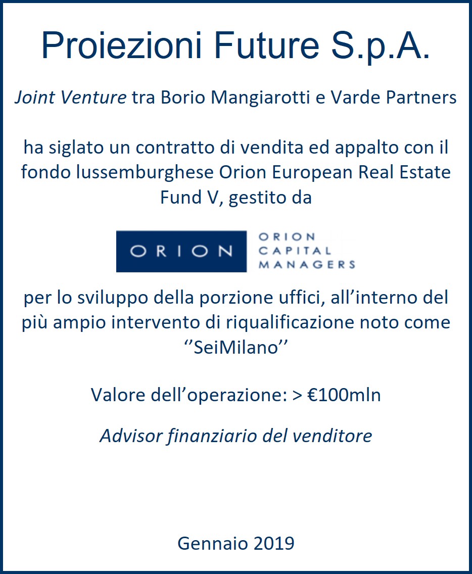 Assistenza e consulenza finanziaria professionale continuativa da parte di Vitale&Co Real Estate nei confronti di Proiezioni Future S.p.A., joint venture tra Borio Mangiarotti e Varde Partners, nell’ambito dell’operazione di dismissione di un terreno con destinazione d’uso uffici e contestuale contratto di appalto, all’interno del più ampio progetto di sviluppo noto come “SeiMilano”. L’acquirente è il fondo lussemburghese “Orion European Real Estate Fund V”, gestito da Orion Capital Managers.