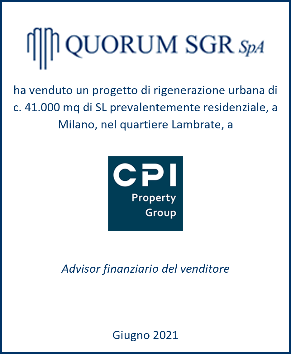 Vitale ha agito in qualità di financial advisor di QUORUM SGR S.p.A. nella dismissione di un progetto di rigenerazione urbana, avente destinazione prevalentemente residenziale, situato a Milano nel quartiere Lambrate e di proprietà del fondo immobiliare chiuso “Fondo Q2”, gestito da QUORUM SGR, a CPI Property Group, primario gruppo ceco proprietario di immobili a reddito a Berlino, Praga, Varsavia e in UE.