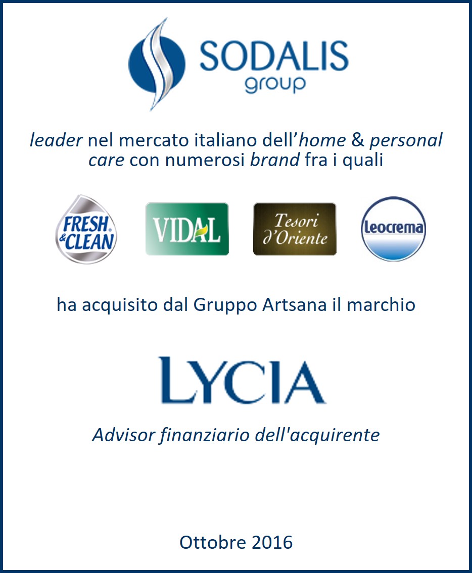 Assistenza al Gruppo Sodalis nell’acquisizione del business a marchio Lycia, marca storica italiana operante nel mercato della cosmetica, igiene e bellezza dal Gruppo Artsana.